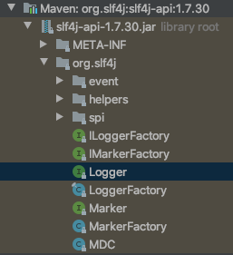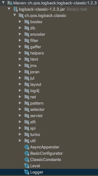 소스상의 Facade 객체는 Logger라고 말씀드렸습니다. SLF4J 패키지를 까보니 Logger에 해당하는 Interface를 제공하는것을 볼 수 있습니다. SLF4J는 실제 구현부가 아닌 로깅 시스템을 공통으로 쓸 수 있도록 구조화해 바인딩과 인터페이스를 제공하는 역활이니 실제 우리가 사용하는 Logger의 구현체는 Logback, Log4J2 등 SLF4J를 지원하는 로깅 패키지에 있습니다.
